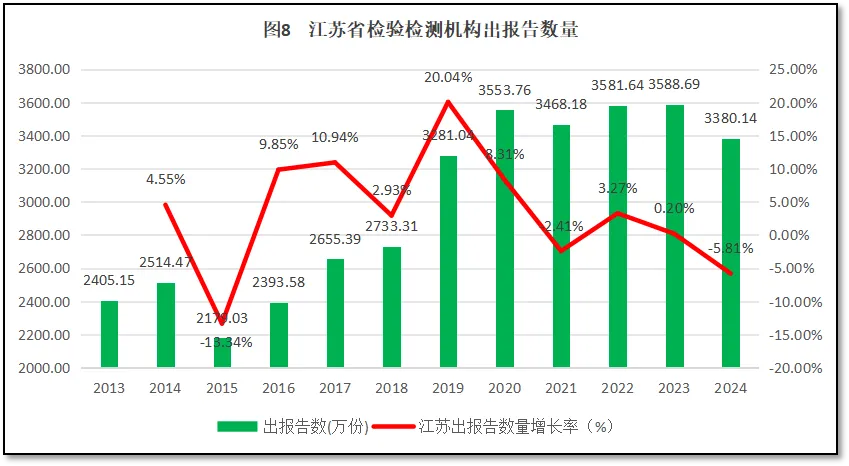 从图8来看,江苏省检验检测机构年度对外出具检验检测报告数量在2015-2019年期间增长较快,但从2020年以后则基本上没有大的增长,各年数据起伏不定,保持相对稳定。2024年江苏省检验检测机构出具3580.14万份报告,较2023年减少了约208万份。出报告数量在全国排名保持第13名,处于中游位置。