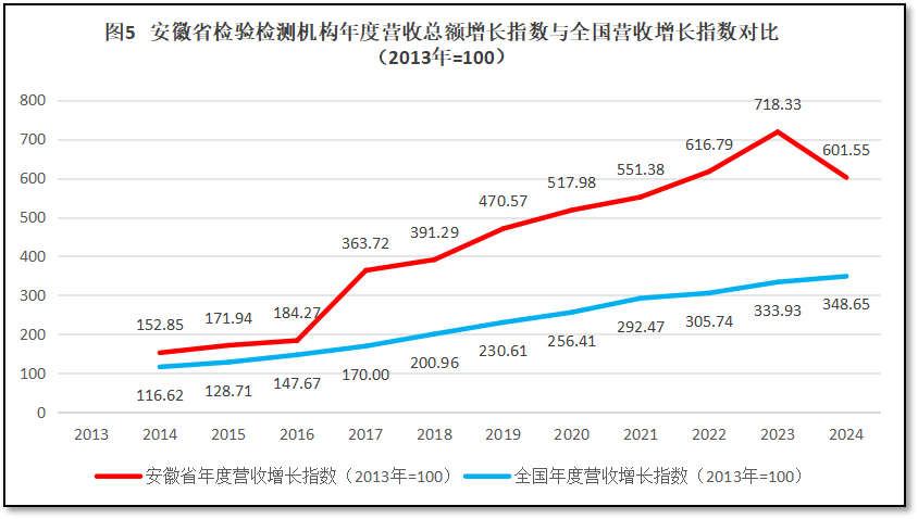 由图5可见,安徽省检验检测机构营收总额增长指数一直保持着高于全国平均数的水平发展,曲线始终高于全国平均线,但2016年之前高出不多。2017年之后,安徽省的曲线逐步拉开了与全国曲线的差距,到2023年差距一度拉大到相差384左右。但2024年,由于安徽省检验检测机构营收总额大幅下跌,与全国的曲线差距大幅缩小,仅相差253左右。这说明安徽省检验检测行业发展出现较大问题,需要引起当地同行的重视。